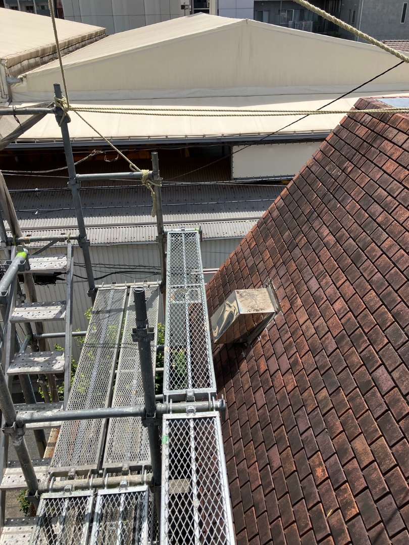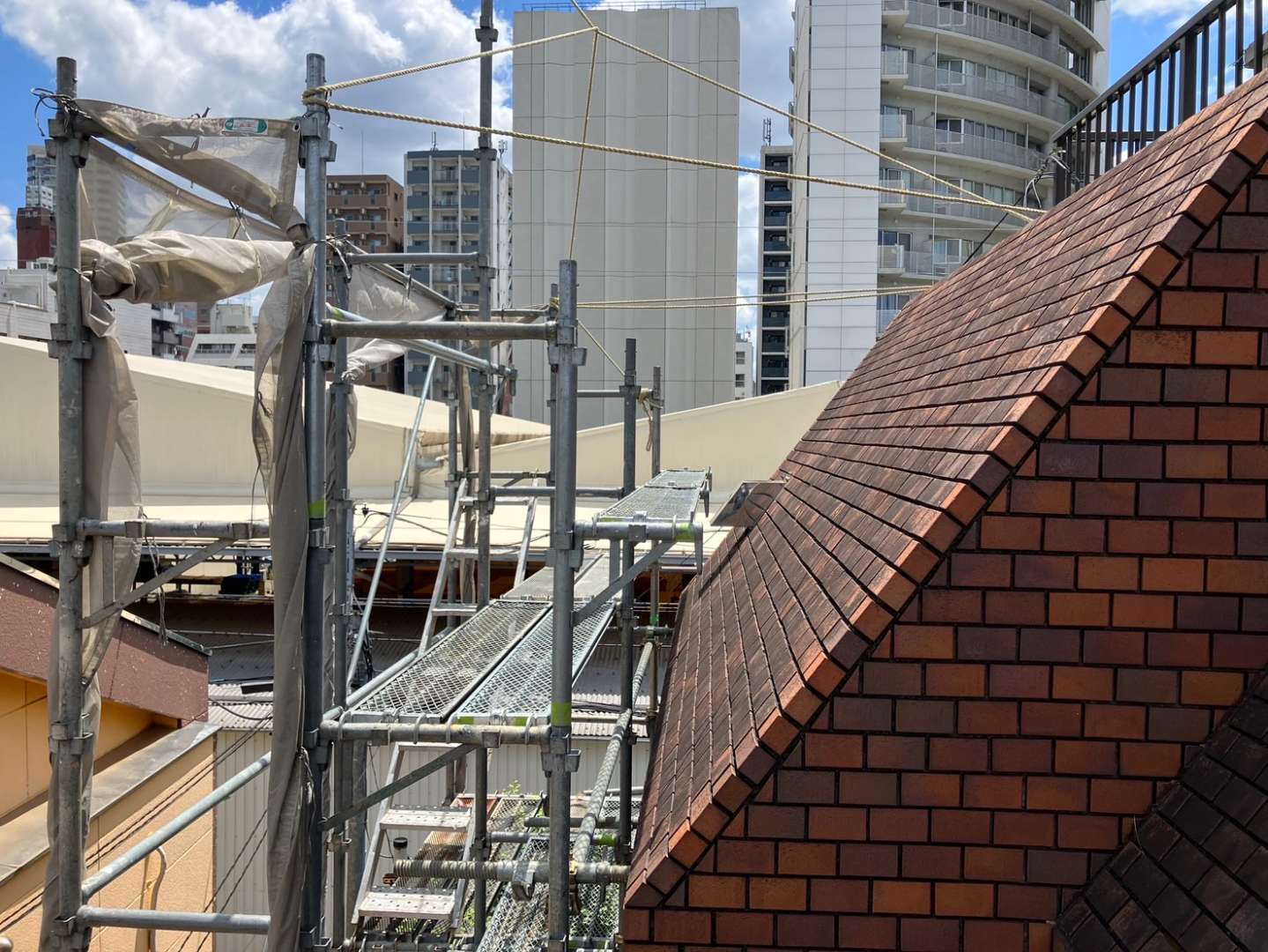 ・部分的な足場で壁つなぎを打たないよう、上部笠木でハサミコミしたりロープで補強し倒壊防止をしました。