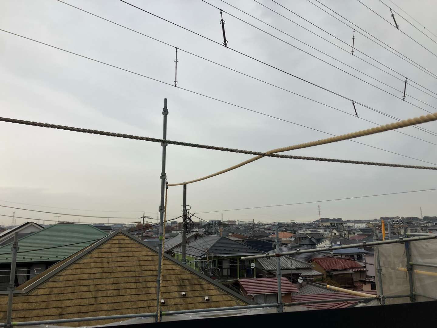 ・配管などあり、敷地的にジャッキベースをブロック上部に建てる為、ジャッキが滑らない用クランプで根がらみを補強し、上部でも親綱を2本クロスし倒壊防止を含め安全に出来るように施工しました。
